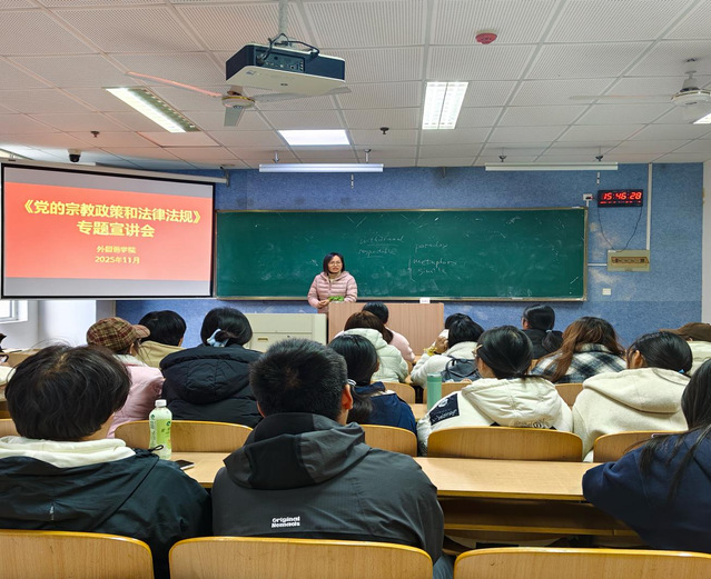 外国语学院在新生入学教育活动中举办《党的宗教政策和法律法规》专题宣讲会。活动由25级辅导员李桂莉主讲。