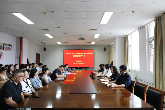 会上,周珊珊书记系统梳理了习近平总书记自党的十八大以来关于师德师风建设的系列重要讲话精神,重点解读了“四有”好老师标准、“四个引路人”要求以及“四个相统一”内涵。结合外语学科特点,她强调:“外语教师不仅是语言文化的传播者,更是中国故事的讲述者、中外文明交流互鉴的推动者,必须以更高的政治站位、更严的师德标准要求自己,做到‘经师’与‘人师’相统一。”