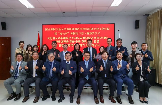 2026 年 4 月 9 日下午,国立韩国交通大学尹胜照校长一行来访我院,调研韩国语专业文化建设,并出席 “校长杯” 韩国语口语大赛颁奖仪式。我校校长张农、国际交流合作处处长董良峰、外国语学院相关负责人及韩国语专业师生代表参会,会议由副院长尚建国主持。